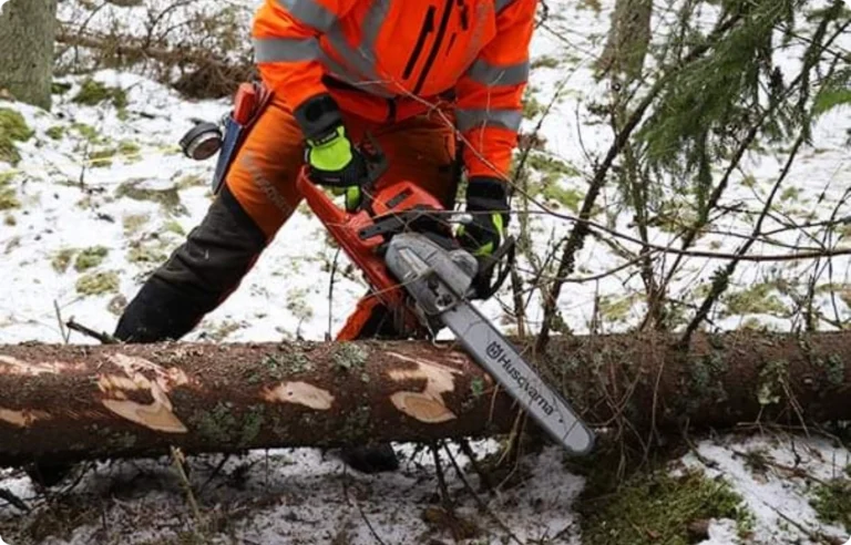 Vi fäller träd säkert och effektivt, oavsett om de står fritt eller trångt till nära hus. Vi har motorsågskörkort (A+B+E) och skylift för sektionsfällning på höga höjder.